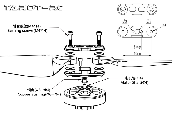 Tarot最新出品的新款折疊槳夾座,采用6061T6鋁合金全CNC加工,適用于對(duì)稱螺絲孔中心距12mm的各款電機(jī),和槳根厚度5mm及以上的各類折疊槳。配套一顆Φ6轉(zhuǎn)Φ4的銅套可方便于Φ6/Φ4的兩款電機(jī)軸安裝的相互轉(zhuǎn)換,此款金屬槳夾座安裝方便,配套各款折疊槳使用可使效率更高。