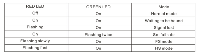 Turn on the transmitter,connect the battery to the receiver while pressing receiver is F/S button.After the red LED is off and green LED is solid the binding process is completed and the receiver is operating normally.