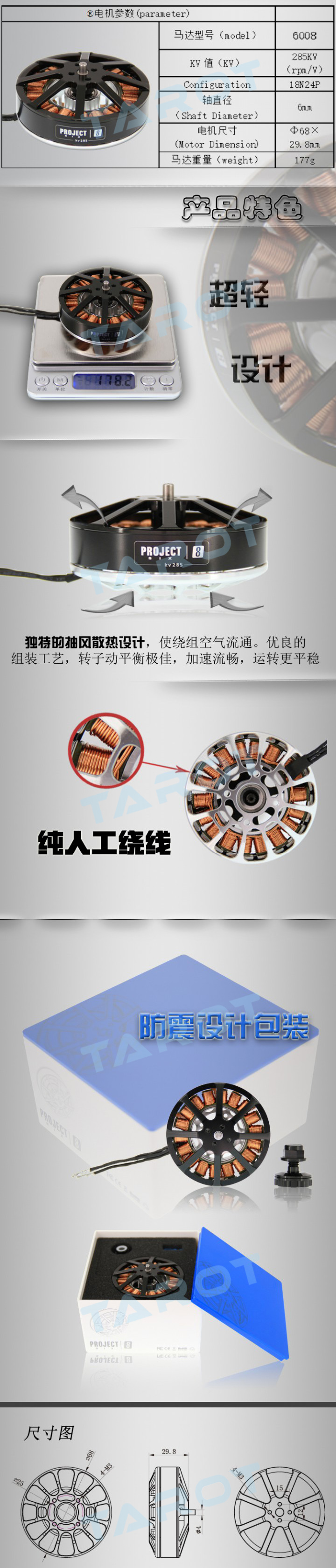 產(chǎn)品名稱:Tarot 無刷電機(jī)/多旋翼高效馬達(dá)/6S/6008/285KV TL60P08