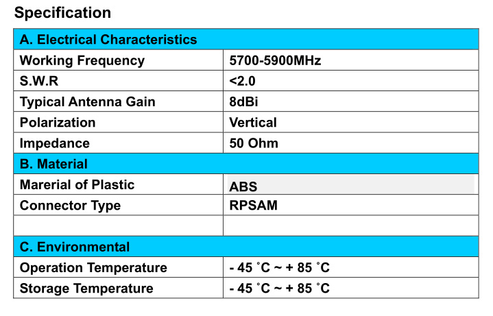 頻率 5700-5950mhz增益 8db筑波比 1.5極化方式 圓極化(注意:發(fā)射端扇面對準(zhǔn)接收端,效果加倍。)