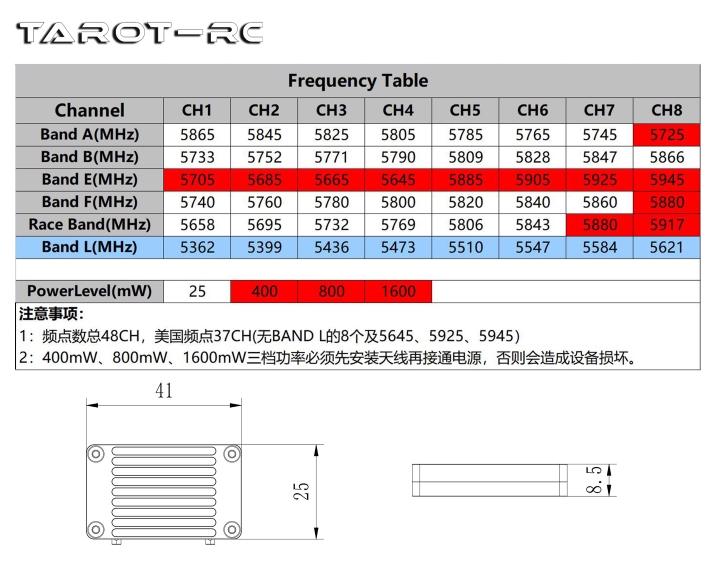 | Tarot 圖傳/5.8G/48通道/功率可調(diào)/1600mW發(fā)射端 TL300N6 |