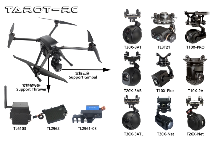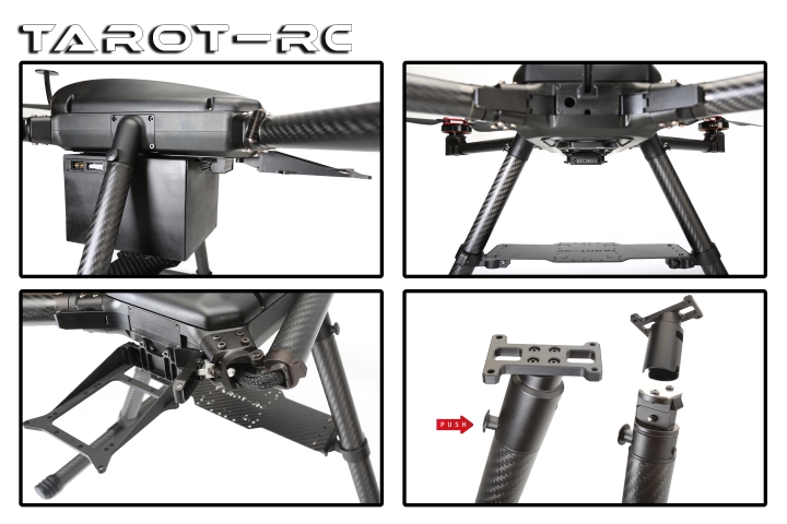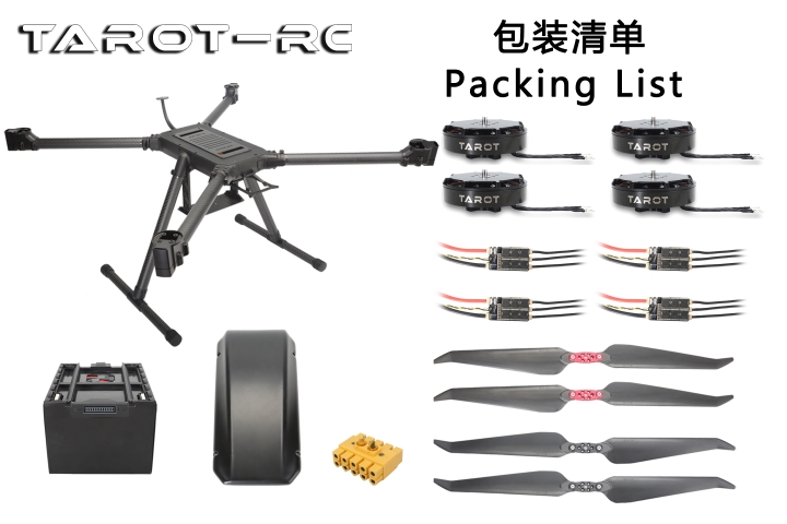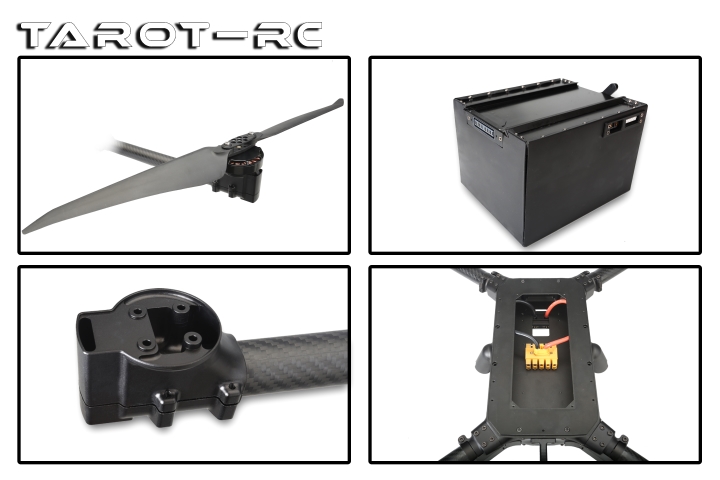 Tarot全新出品四軸飛行器是為專(zhuān)業(yè)航空攝影用戶(hù)設(shè)計(jì)的一款多軸飛行器套裝,套裝包含機(jī)架、電機(jī)、電調(diào)、槳、快拆電池。全鋁合金一體中心倉(cāng),新穎可快拆式T型腳架,以及機(jī)臂前后折疊設(shè)計(jì),整體具有輕量化,攜帶方便等特點(diǎn)?蛰d起飛重量約6.3KG,最大額外載重3KG,輕松搭載單反等航拍設(shè)備,具備空載65分鐘長(zhǎng)續(xù)航留空時(shí)間。升級(jí)配置可增加續(xù)航時(shí)間。