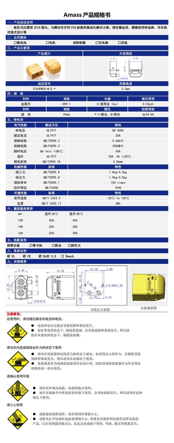 產(chǎn)品名稱:艾邁斯/Amass 插頭/大電流板連接器公頭/XT60PW-M TL3602