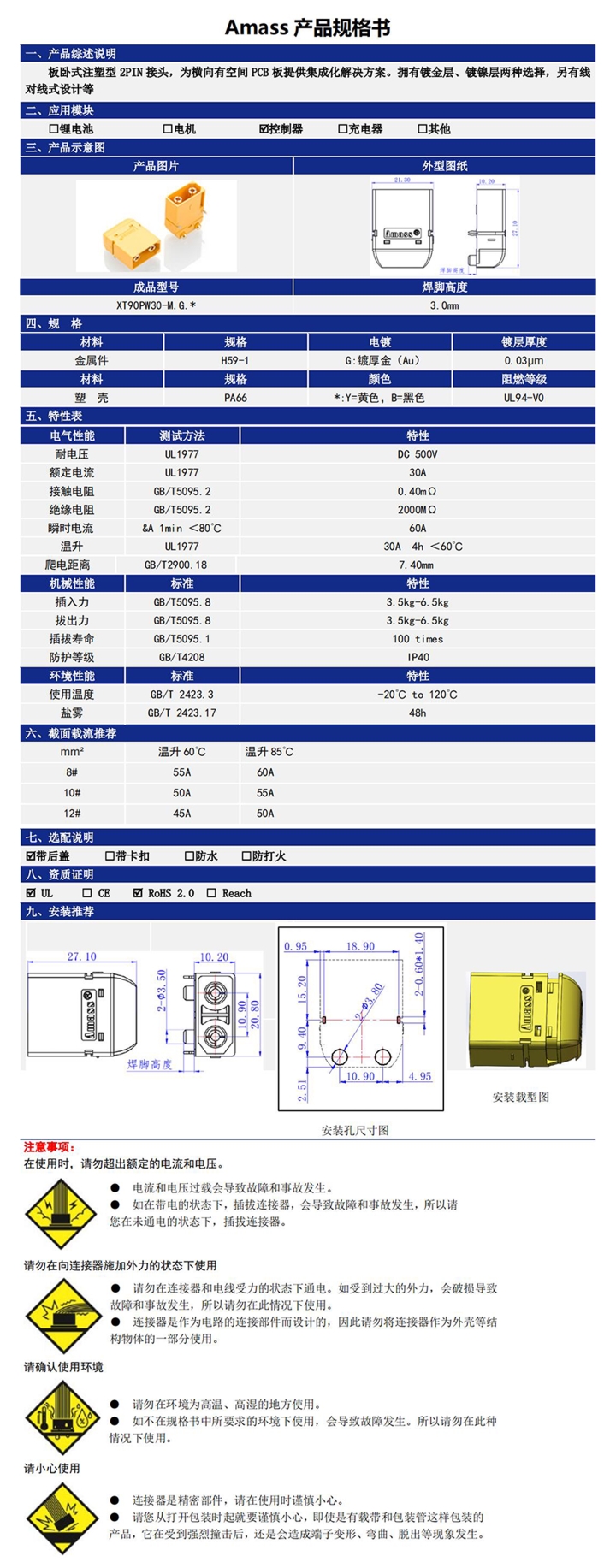 產(chǎn)品名稱:艾邁斯/Amass 插頭/大電流板連接器公頭/XT90PW-M TL3604